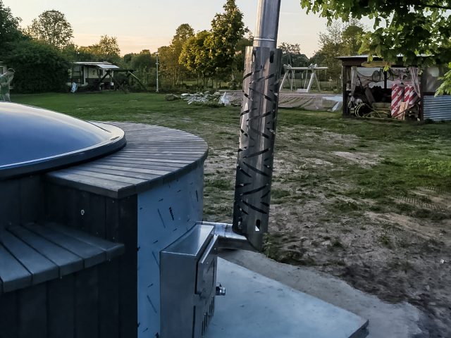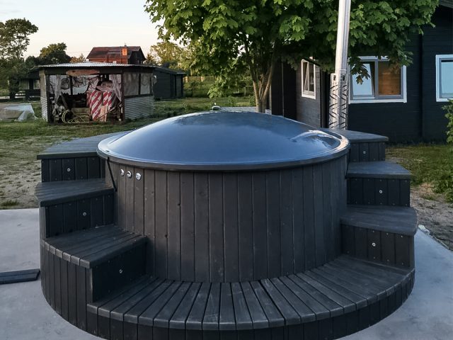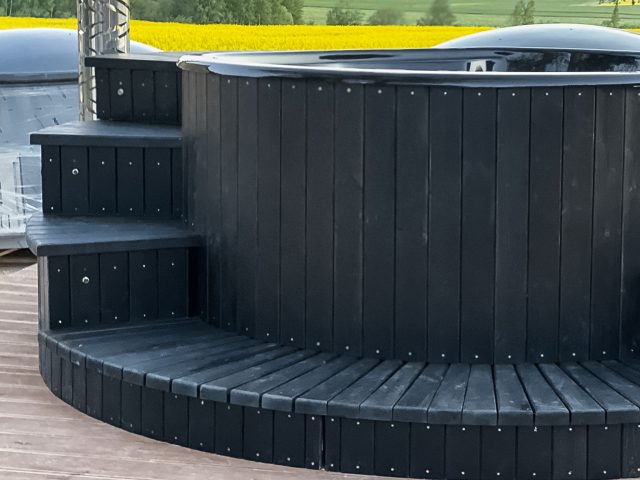 Hot tub with enclosing stairs, integrated stove, hydromassage, LED in the stairs