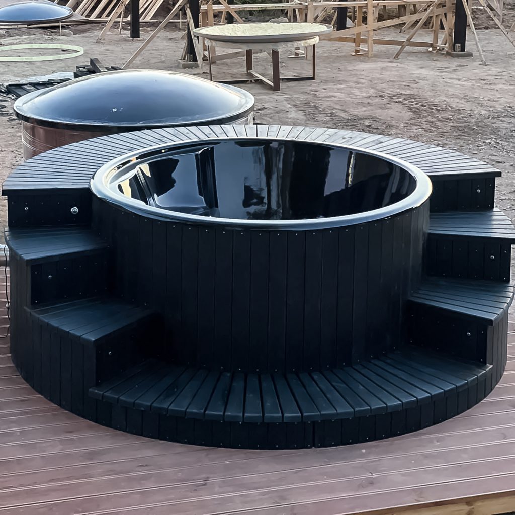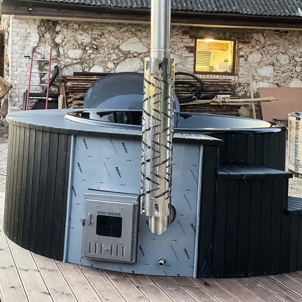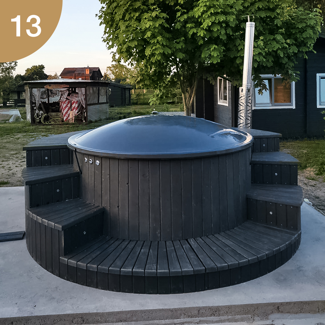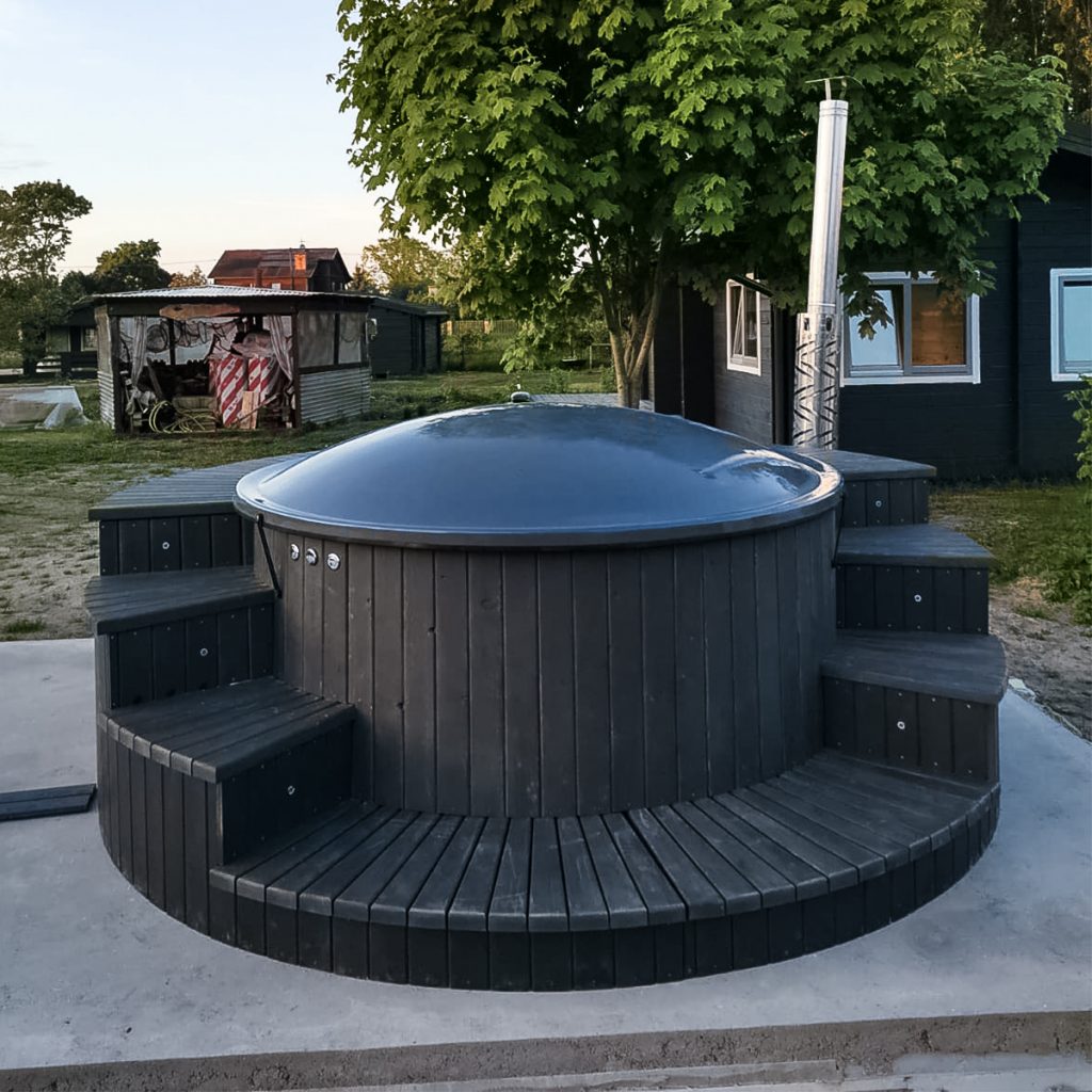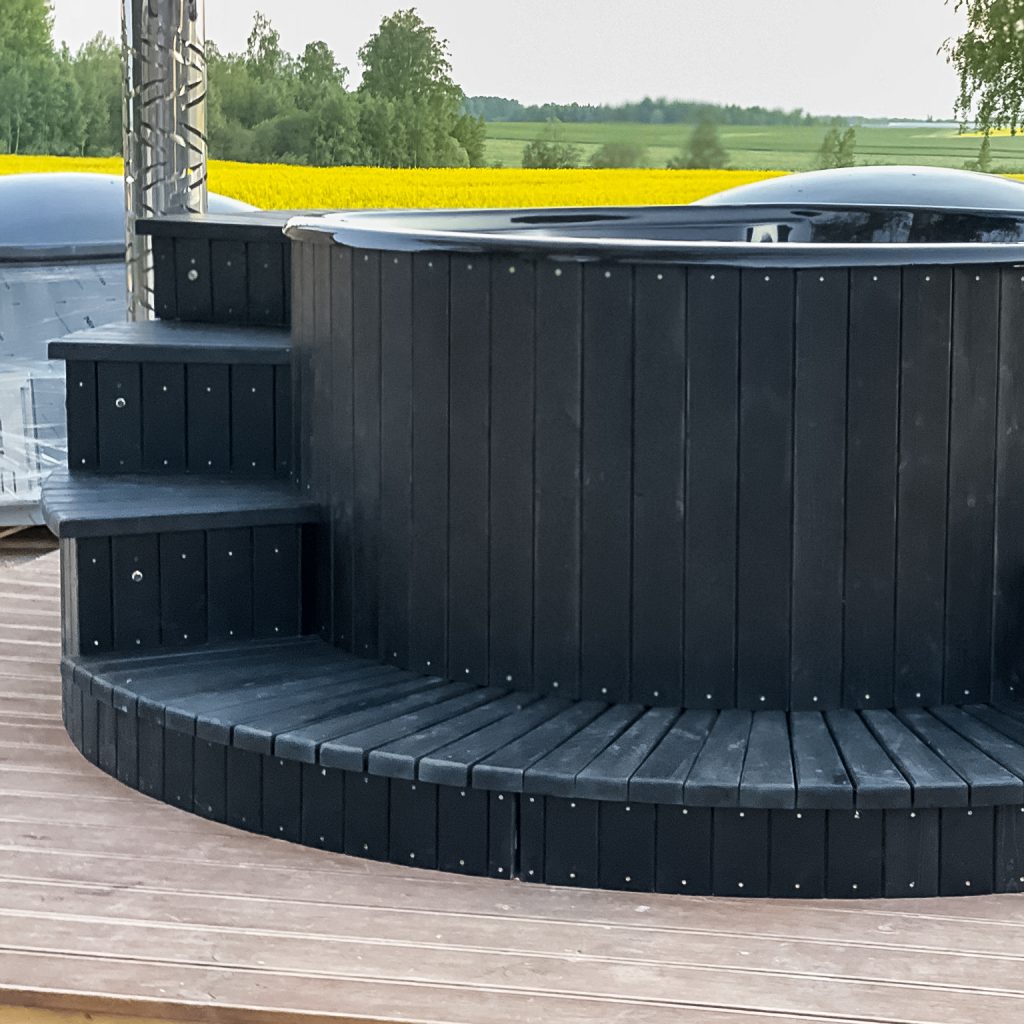 Hot tub with enclosing stairs, integrated stove, hydromassage, LED in the stairs