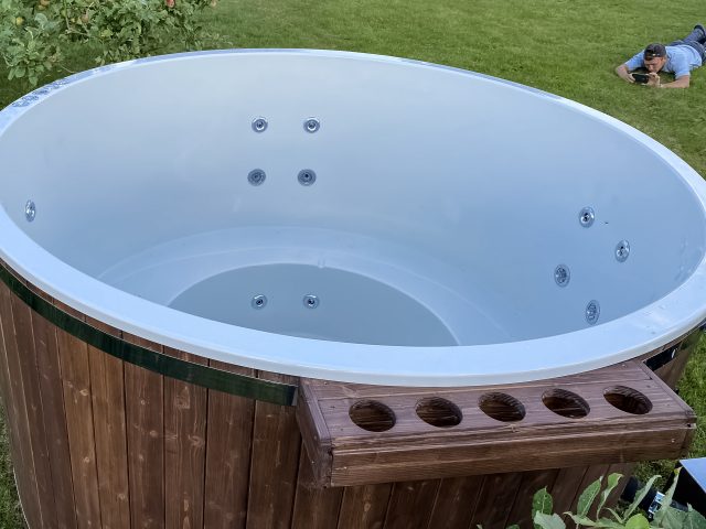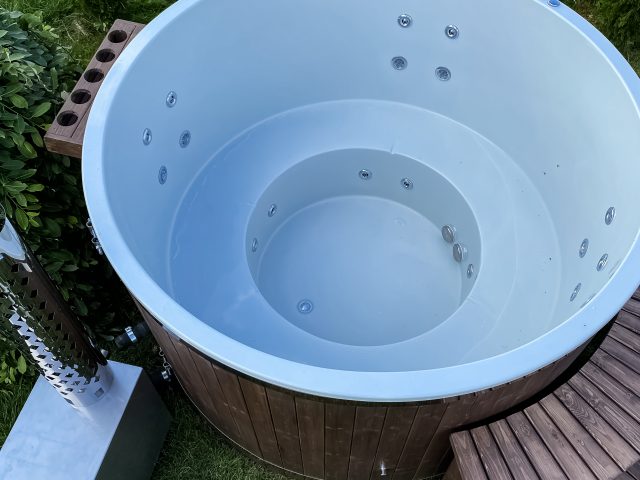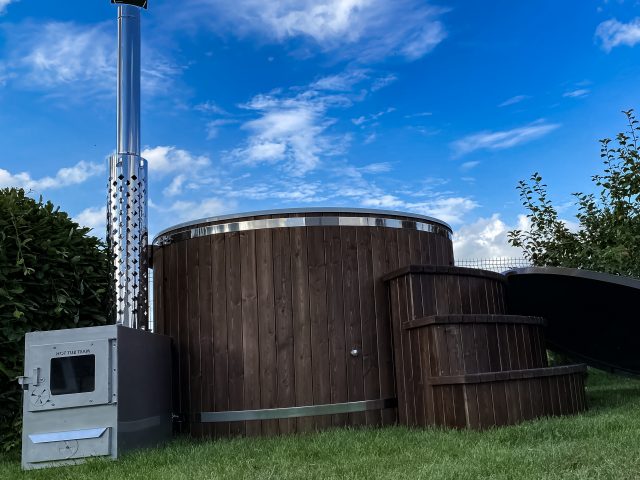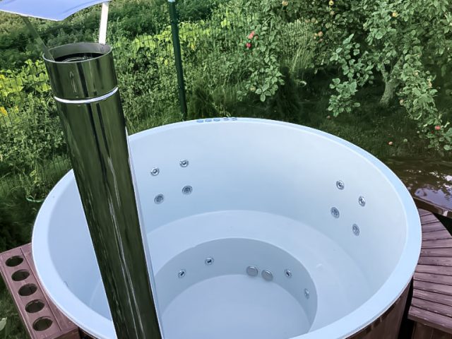 Hot tub with external stove, 26-jet hydromassage, integrated LED