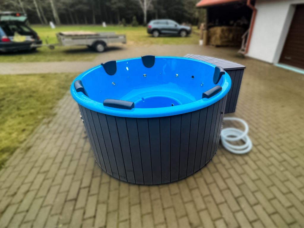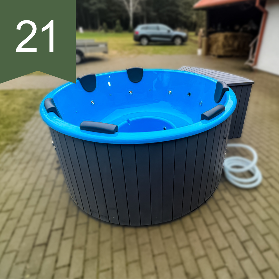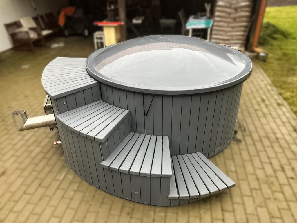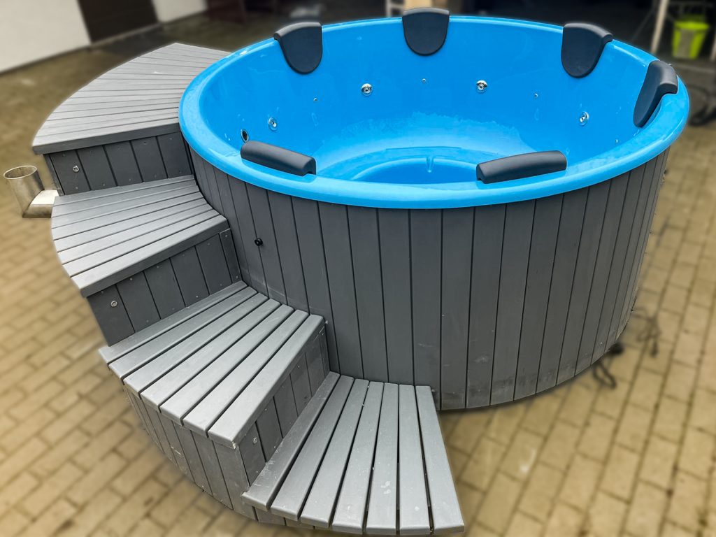 Kubls ar ārējo krāsni, ¼ apkļaujošās kāpnes, LED rgb apgaismojums, hidromasāžas sistēma…