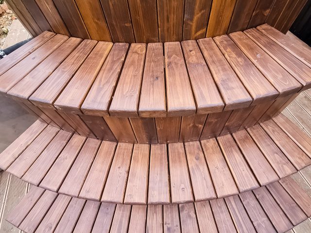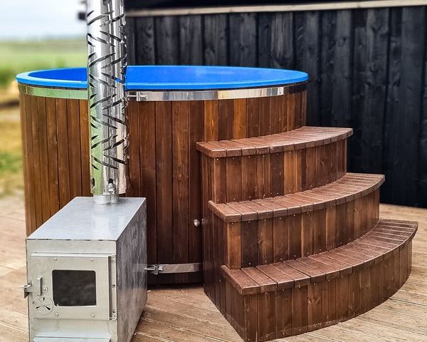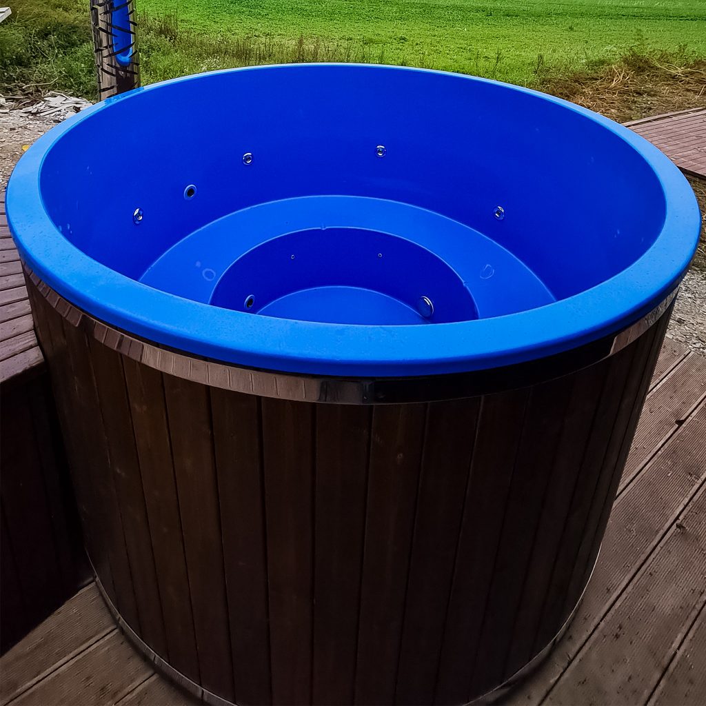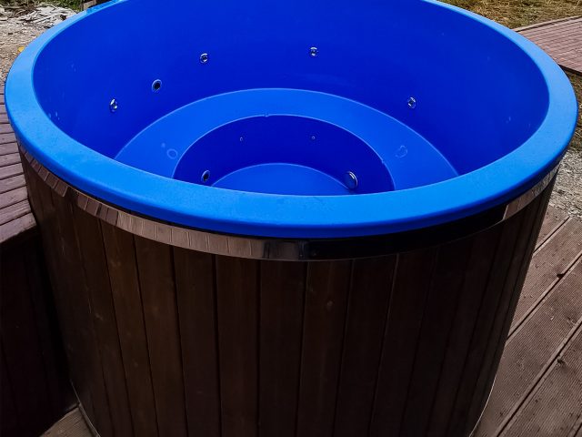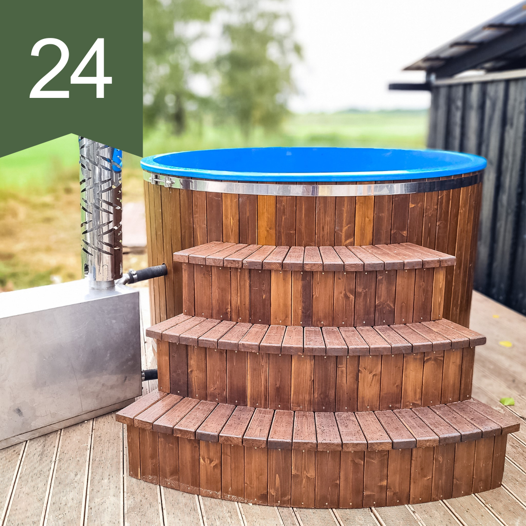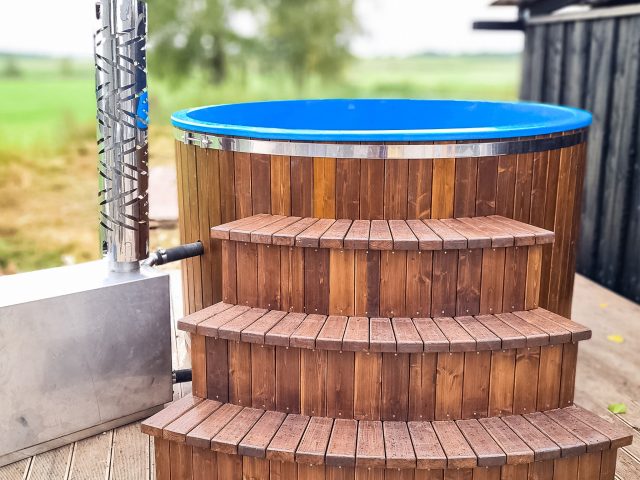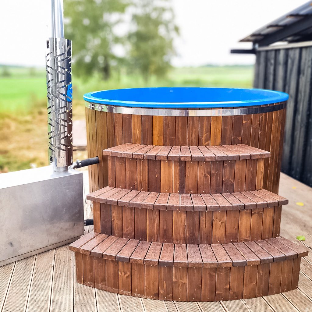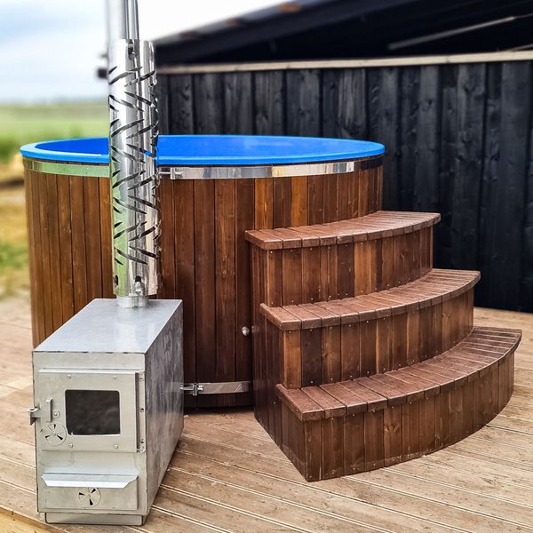 Augstais kubls ar ārējo krāsni, platās pusapaļās kāpnes – 3 pakāpieni, dzērienu galdiņš, LED rgb apgismojums, hidromasāžas sistēma Kas ietilpst tieši šī kubla aprīkojumā un cenā skatiet sadaļā ”Aprīkojums”.