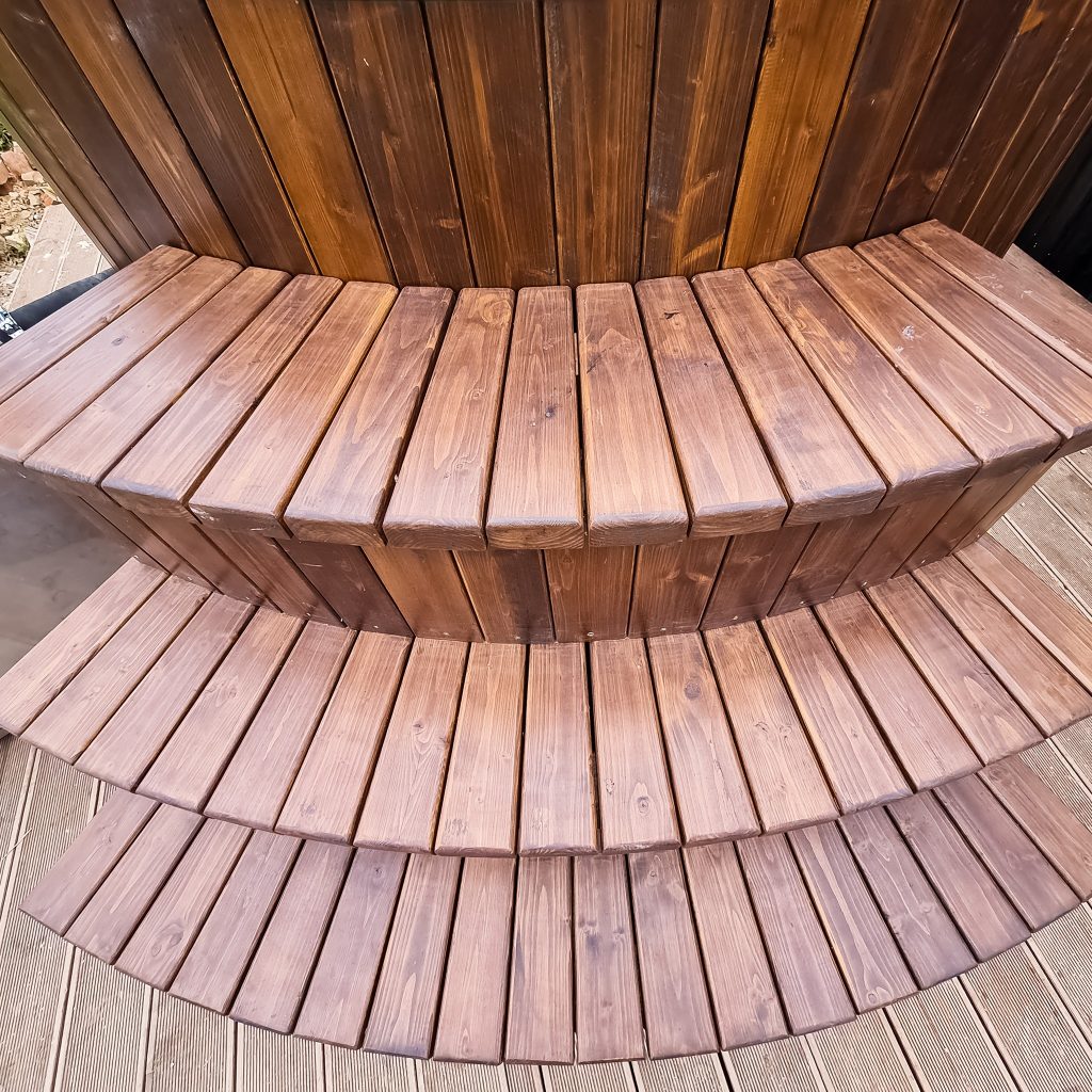Augstais kubls ar ārējo krāsni, platās pusapaļās kāpnes – 3 pakāpieni, dzērienu galdiņš, LED rgb apgismojums…